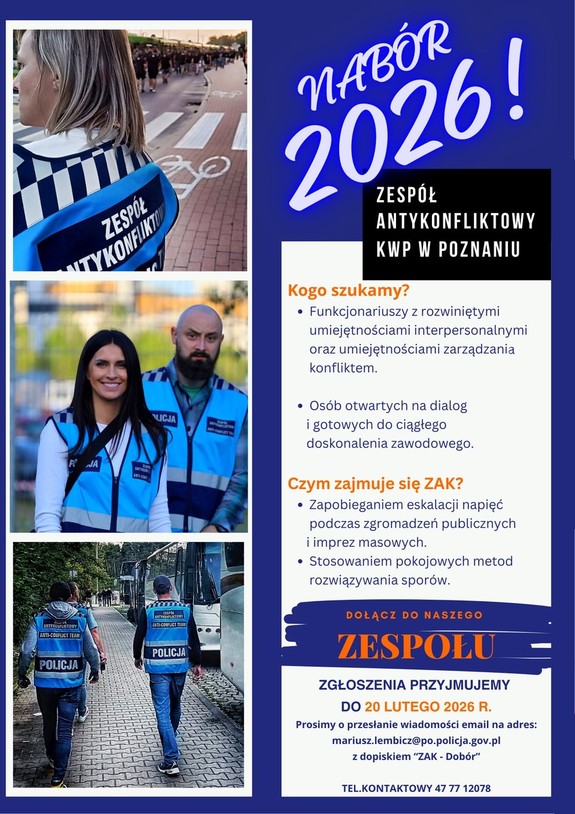 Sztab Policji w Komendzie Wojewódzkiej Policji w Poznaniu organizuje dobór do Nieetatowego Zespołu Antykonfliktowego. Wszyscy chętni policjanci mogą zgłaszać swoje kandydatury do dnia 20 lutego br. W skład Zespołu Antykonfliktowego (ZAK) wchodzą policjanci wszystkich służb z minimum 2-letnim stażem służby, którzy deklarują dobrowolność pracy w „ZAK”. Chętne osoby wezmą udział w kwalifikacji, polegającej na rozmowie wstępnej z zespołem kwalifikacyjnym. Zgłoszenia można wysyłać na maila: mariusz.lembicz@po.policja.gov.pl