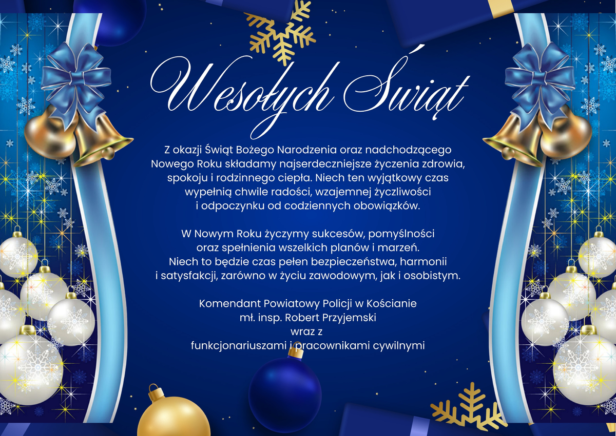 Życzenia świąteczne Komendanta Powiatowego Policji w Kościanie Data publikacji 23.12.2025 Powrót Drukuj Z okazji świąt Bożego Narodzenia....