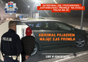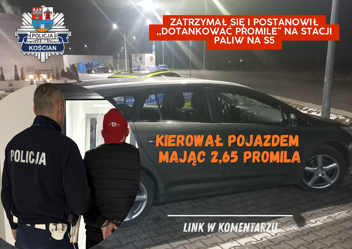 Kierujący pojazdem marki Toyota na drodze ekspresowej jechał „wężykiem” stwarzając realne zagrożenia. Swoją jazdę zakończył na MOP Sierakowo, gdzie zatrzymał się na parkingu przy stacji paliw. Z samochodu wyciągnął „dwusetkę” wódki i napój. Dalszą jazdę i spożywanie alkoholu uniemożliwili mu świadkowie i kościańscy policjanci. Badanie trzeźwości wykazało u mężczyzny aż 2,65 promila alkoholu w wydychanym powietrzu. Po wytrzeźwieniu usłyszy zarzuty, a o jego dalszym losie zadecyduje Sąd.