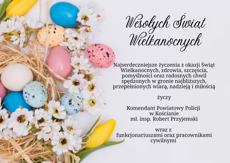 ŻYCZENIA WIELKANOCNE KOMENDANTA POWIATOWEGO POLICJI W KOŚCIANIE Data publikacji 03.04.2026 Powrót Drukuj